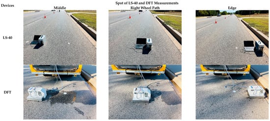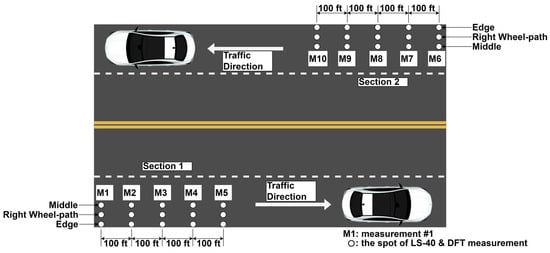 As shown in Figure 2, a total of 30 pairs of pavement texture and friction data were systematically collected from two sections along three distinct locations with different levels of traffic polishing: the middle, right wheel path, and edge of the outer travel lane. In each section, measurements for texture and friction were taken at five locations, each spaced 30.5 m (100 feet) apart. Figure 3 displays images of devices utilized for field data collection on the three locations: a 3D laser imaging device, LS-40, which reconstructs 3D images with a resolution of 0.01 mm to characterize pavement texture; and a DFT, employed to evaluate pavement friction at varying speeds (10–70 km/h).