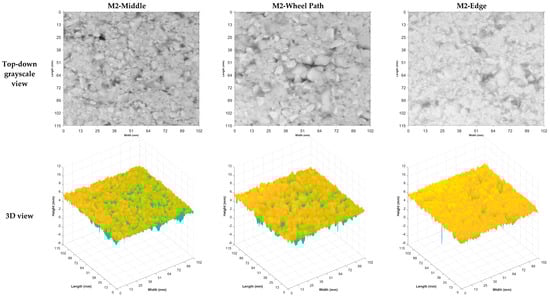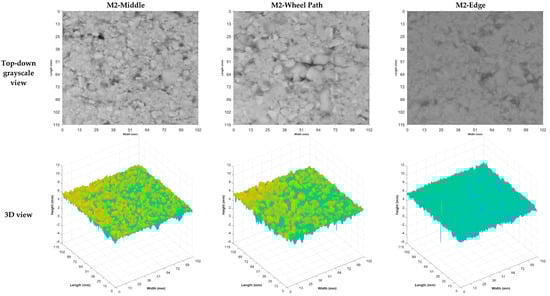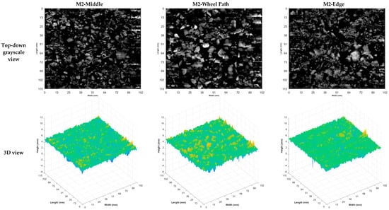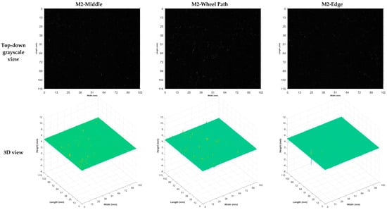 In Figure 6, the macrotexture images in top-down grayscale view and 3D view distinctly reveal that many aggregates are exposed in the image of wheel path due to extensive traffic polishing, followed by the image of middle of the travel lane and the image of edge of the travel lane. In the 3D view images in Figure 7, spikes are evident in the microtexture of the wheel path, with fewer spikes seen in the images of the middle and edge of the travel lane. This is because the wheel path as more valleys and variations in texture height along the valleys produce high-frequency information or low-wavelength textures, which are filtered out as spikes in the microtexture images. However, these spikes have small height values (less than 2 mm) while many other non-spike pixels of the microtexture images have height values close to zero. In grayscale images, pixel values close to zero are displayed as black, while pixel values close to 1 (or 255, depending on the bit depth) are displayed as white. Therefore, the microtextures images in the top-down grayscale view in Figure 7 are mostly black, with minor bright spots corresponding to the small spikes observed in the 3D view.