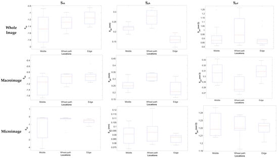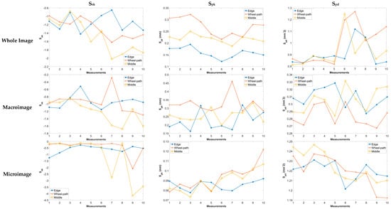 Then, Figure 9 shows the maximum, average, and minimum distribution of Ssk, Spk, and Spd of whole images, macrotexture images, and microtexture images from the middle, right wheel path, and edge of the outer travel lane for all measurements. A few conclusions can be drawn to explain how different levels of traffic polishing affect these 3D areal parameters: