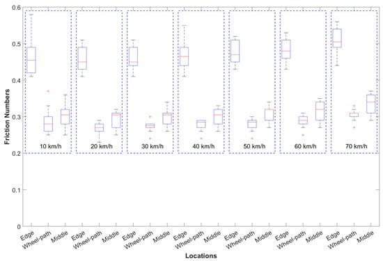 During DFT testing, when rotating speed achieves the target speed, the spinning disk with three testing rubber sliders will drop off and gradually stop spinning due to pavement skid resistance. Therefore, the DFT is able to measure and save pavement friction numbers from testing speeds of 10–70 km/h. Figure 10 displays the maximum, average, and minimum distribution of DFT numbers for testing speed of 10–70 km/h from the middle, right wheel path, and edge of the outer travel lane. A few conclusions can be drawn to explain how different levels of traffic polishing affect pavement friction:
