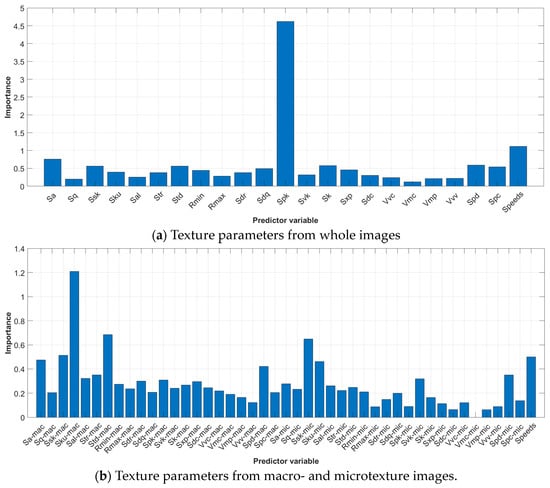 Particularly, for RF models, six different numbers of trees (50, 100, 150, 200, 250, and 300) were considered during model development to select the best model. Additionally, each RF model used all predictor variables at each node to ensure that every tree utilized all predictors. The importance of each input was estimated by permuting out-of-bag observations among the trees to select the critical texture parameters for friction prediction via RF models, as shown in Figure 11. Finally, variables with importance larger than 0.5 were selected to develop the RF models. For instance, as shown in Figure 11a, Sa, Ssk, Std, Spk, Sk, Spd, and Spc from whole images and speeds are selected as critical texture parameters for friction prediction when using Input 1.