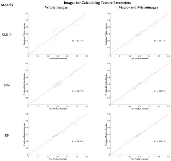 Therefore, the R-squared values of the best friction prediction models via Input 1 and Input 2 are listed in Table 2. Specifically, Ssk, Spk, Spd, and speeds are the selected parameters in SMLR when using whole images, while Sku-mac, Str-mac, Std-mac, Rmin-mac, Str-mac, Sdq-mac, Sk-mac, Sxp-mac, Vmc-mac, Spd-mac, and Spc-mac from macrotexture images, Rmax-mic and Spc-mic from microtexture images, and speeds are the most selected parameters in SMLR when using macro-/microtexture images. Also, Sa, Ssk, Std, Spk, Sk, Spd, and Spc from whole images and speeds are the selected parameters in RF with 100 trees when using whole images, while Ssk-mac, Sku-mac, Std-mac from macrotexture images, Ssk-mic from microtexture images, and speeds are the selected parameters in RF with 250 trees when using macro-/microtexture images. Further, Figure 12 shows the testing examples of the SMLR, NN, and RF models from 10 cross-validations using the prepared testing data from Input 1 and Input 2.