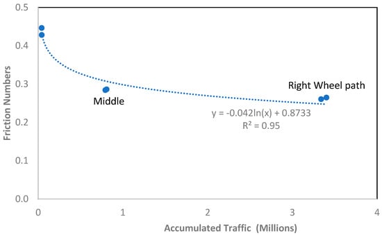 Accordingly, from 2015 to 2022, the accumulated traffic is estimated as 4.13 million on Section 1 and 4.23 million on Section 2. Then, per assumption (3), the accumulated traffic along the edge, wheel path, and middle of the two testing sections are estimated and listed in Table 4. Figure 13 shows the logarithmic relationship between pavement friction numbers and accumulated traffic along roadway edge, wheel path, and middle areas, achieving an R-squared value of 0.95. Figure 13 presents a slower friction decrease rate as traffic accumulated on the pavement. Furthermore, it means that friction numbers along roadway horizontal direction (edge, middle, wheel path, etc.) could represent different stages of the evolvement of pavement skid resistance under various levels of traffic polishing and environmental impact in the field.