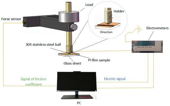 The TENGs were composed of 304 stainless steel and four polymeric components (PDMS, PTFE, TPU, and PI) in this study. The schematic of the experimental setup is shown in Figure 1, which is designed to simultaneously measure the COF and triboelectrical performances (voltage, current, and charge) in a ball-on-flat configuration. The actual experimental device is shown in Figure S1A. The 6.35 mm diameter ball-shaped 304 stainless steel served as the upper friction pair, while the PI film as a representative measuring 35 mm × 35 mm × 0.2 mm acted as the lower friction pair. The 304 stainless steel ball was securely mounted in copper foil, clamped by a polyether ether ketone rod, and attached to the friction testing machine. A copper wire connected the 304 stainless steel ball to a programmable electrometer (Keithley 6514 Electrostatic Meter, Tektronix, Shanghai, China), with the electrometer grounded. The PI film was adhered to a glass sheet measuring 35 mm × 35 mm × 3 mm using 3M double-sided adhesive tape as the lower friction pair of the TENG. Subsequently, the glass sheet was secured within a poly-ether-ether-ketone (PEEK) box. A pipette gun was utilized to apply lubricant (50 µL) onto the PI surface before initiating the sliding motion between the steel ball and PI film.