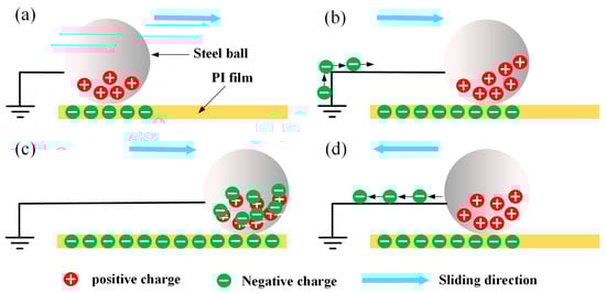 The selection of the materials of the friction pairs in TENGs is important for enhancing the output electrical performances, such as the short-circuit current () and open-circuit voltage (). Four materials were chosen to investigate the effect of the materials of friction pairs on triboelectrical performances. The process of triboelectric charge accumulation on the steel ball in the dry friction state is displayed in Figure 2. When the steel ball and the PI film came in contact, the steel ball became positively charged and the PI became negatively charged. Equal positive and negative charges accumulated in the contact area (Figure 2a). The electrons were transferred from the earth to the PVDF through the ground wire and the steel ball during sliding (Figure 2b,c). When the steel ball slid in the opposite direction, electrons flowed into the ground, which generated a negative current (Figure 2d), then began the next cycle. This is in accordance with the work presented in [24].