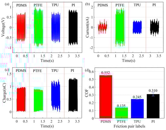 Due to PI’s electron-withdrawing nature, TENGs have a higher voltage output. The tribological behaviors of the contact pair play a key role in the life duration of TENGs. The variation curves of COF of the four polymer materials (PDMS, PTFE, TPU, and PI) are shown in Figure S3, and the average COF at the steady state is shown in Figure 2d. PTFE demonstrates the lowest coefficient, followed by TPU, PI, and PDMS. The electrical output properties of the different materials of TENGs are different, possibly because the roughness of the material surface is also an influencing factor [35,36]. Generally, the COF, to some degree, reflects the performance of wear resistance. Though the PI material has excellent triboelectrical performance, the poor performances of the friction and wear resistance could affect the life duration, thus limiting the application of the PI material in TENGs.