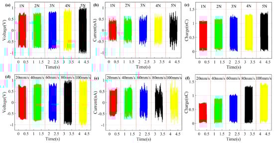 In order to determine the appropriate parameters for the subsequent experiments, the influence of the load and velocity on the triboelectric properties of the PI film sliding with a steel ball under dry conditions was investigated. Figure 4 illustrates the triboelectric performances of the PI film and a 304 stainless steel ball at various sliding velocities (20 mm/s, 40 mm/s, 60 mm/s, 80 mm/s, 100 mm/s) and different loads (1N, 2N, 3N, 4N, and 5N). Based on the observed results depicted in Figure 4a–c, it is evident that the voltage, current, and charge generated by the TENGs under a 1N load are consistently lower compared to those under a 5N load. This indicates that the mechanical force applied to the TENGs affects their electrical output, with higher loads resulting in an increased electrical output performance. Similarly, as illustrated in Figure 4d–f, the voltage, current, and charge output of the TENGs at a velocity of 20 mm/s are consistently lower than those generated at a velocity of 100 mm/s. This suggests that the velocity of operation also influences the electrical output performance of TENGs, with higher frequencies leading to an enhanced electrical output.