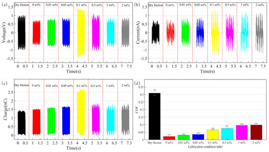Many studies have demonstrated the effectiveness of lubrication in improving the electrical output performance of TENGs. For example, Wu et al. [22] observed a significant improvement in frictional performance and electrical output performance after long sliding cycles by adopting liquid lubrication. Similarly, Wang et al. [23] also found that the addition of specific lubricants to the friction surface can lead to a significant reduction in the coefficient of friction (COF) and an improvement in the electrical energy conversion efficiency. Additionally, Liu et al. [24] studied the effect of different polarity liquid lubricants on the frictional electricity of friction pairs composed of steel balls and polytetrafluoroethylene blocks. It was found that appropriate lubricants (alkanes and alkenes) and the quantity of liquid can increase the triboelectric signal, achieving a long-term stable output, while the COF is significantly reduced. Qiao et al. [25] used an MXene solution as a lubricant to increase the output current density of TENG to a high value of 754 mA/m2, and achieved a durability of 90,000 cycles at the same time. Yang et al. [26] achieved a decrease in the COF from 0.76 to 0.16 by adding polyalphaolefin PAO4 as a lubricant at the metal-semiconductor heterojunction interface of the planar structure while maintaining the DC output voltage almost constant.