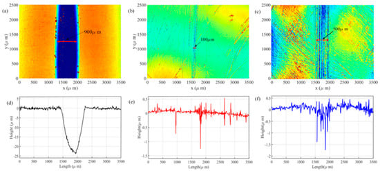 In Figure 6a,d, corresponding to dry friction conditions, the sample surface exhibits wide and deep wear traces, indicating substantial material loss and surface damage resulting from friction. As shown in Figure 6b,e, the widths and depths of the wear traces significant decrease. This reduction in wear trace dimensions suggests that the application of TiO2-doped oleic acid as a lubricant effectively reduces friction and slows down surface wear. As shown in Figure 6c,f, both of the widths and depths of the wear traces under lubrication at a concentration of 2 wt% are larger than that at a concentration of 0.1 wt%. More scratch marks were observed, which were mainly caused by the TiO2 nanoparticles sandwiched between the PI film and steel ball. The hardness of the TiO2 nanoparticles is much greater than that of the PI, which results in abrasive wear during the sliding process.