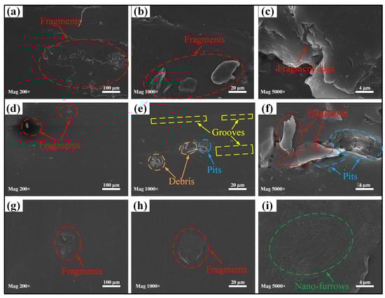Figure 8 shows the SEM image of the wear traces of the PI film under various magnifications under dry friction, oleic acid lubrication, and TiO2-doped oleic acid lubrication. As it can be seen from Figure 8a–c, plenty of fragments can be observed at the wear trace, which are formed by the detached chunks from the PI film during the sliding against the steel ball. It is conceivable that material worn off from the PI surface could adhere to the steel counterpart and then detach due to the shear force, ultimately leading to the formation of fragments. Adhesive wear is the main mechanism for this case. Upon the introduction of lubrication with oleic acid, as illustrated in Figure 8d–f, most of the large fragments disappeared, replaced by a variety of small fragments. In addition, more characteristics, such as parallel grooves, debris, and material removal, that left pits are shown. The grooves on the PI film are formed from what surfaced from the cutting or scraping action by the mating steel ball. The microvolume of the friction surface material is subjected to cyclic contact stress, resulting in repeated deformation, cracks and separation of micro-pits, and fatigue wear.