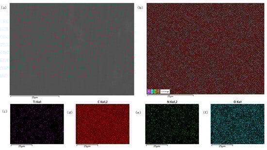 To determine the elemental composition and distribution on the entire wear trace, mapping using energy-dispersive spectrometry (EDS) was performed. The results of the elemental mapping obtained by analyzing the frictional contacts using EDS are presented in Figure 9. The contributions of the PI film (C, H, N, and O), oleic acid (C, H, and O), and TiO2 nano-additives (Ti and O) are indicated in the EDS elemental maps. It can be seen from Figure 9a that numerous slight smooth scratches are located on the wear trace. The EDS mapping (Figure 9b–f) reveals that the characteristic elements, including the Ti element, are distributed on the wear trace uniformly and the TiO2 aggregates in some regions.