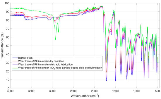 The FTIR spectra of wear traces generated on PI films under various lubrication conditions.