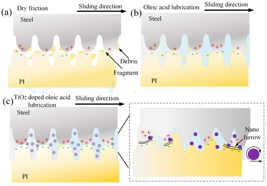According to the above analysis, the behavioral models of the TENG interface under dry friction, oleic acid lubrication, and TiO2-doped oleic acid lubrication are presented in Figure 11. Similar to [30], under dry friction, the friction generates a triboelectric charge accompanied with voltage and current. However, the high friction also leads to the severe wear of the PI film, and some wear debris transfers from the PI onto the steel surface. Some of the debris are scattered and adhere to the PI film again and then form fragments, as shown in Figure 11a. Thus, the coverage of the wear debris and fragments prevents the further generation of the triboelectric charge. The main mechanism is abrasive wear. As shown in Figure 11b, the wear debris and the fragments are drastically reduced with oleic acid lubrication. The main mechanism is change to fatigue wear, resulting in the emergence of cracks in and material removal from the PI interface. Furthermore, the triboelectrical performances change little from those of dry friction. As shown in Figure 11c, the addition of TiO2 nanoparticles reduces the formation of debris from the PI film due to the ratio of TiO2 nanoparticles, therefore increasing the generation of charge as well as voltage and current. In addition, the sliding of TiO2 nanoparticles can make the PI surface furrow, known as the micro-machining effect. Therefore, the contacting area is increased, which ceases the improvement in the triboelectrical performances. Overall, the reduced wear and increased output performances are the combined effect of oleic acid and TiO2 nanoparticles. In addition, the polarity of oleic acid directly affects the generation of friction charge when it comes into contact with a solid material. Oleic acid has properties between polar and non-polar. It not only increases the total triboelectrical charge amount, but also has good lubrication properties, which can reduce the wear of the interface. The surface wettability [50] and molecular behaviors [51] have an effect on lubrication, and may also be closely related to the triboelectrical performances of TENGs. The underlying mechanism is much more complex and still needs exploration.