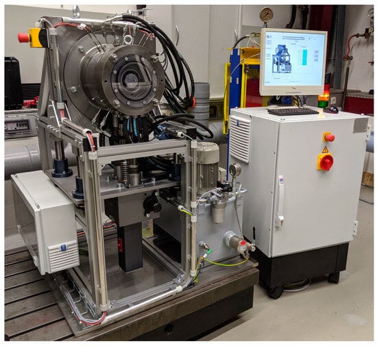 The Chair of Engineering Design has built a test rig as part of an FVA project to investigate the fatigue life of rolling bearings under small oscillating movements []. The WSBP (Figure 1) is a custom test rig that allows four radial bearings to be tested simultaneously. Cylindrical roller bearings (NU210) or deep groove ball bearings (6210) can be used as test bearings.