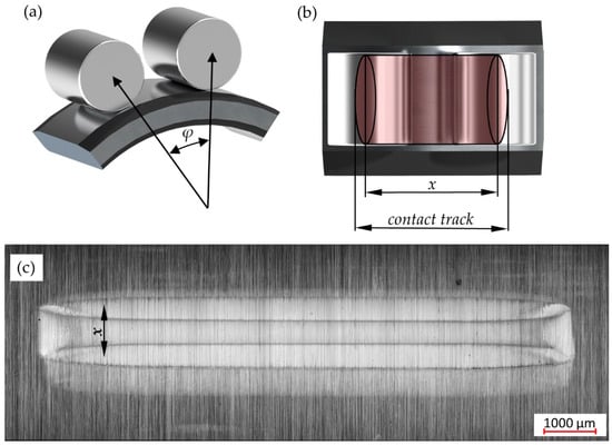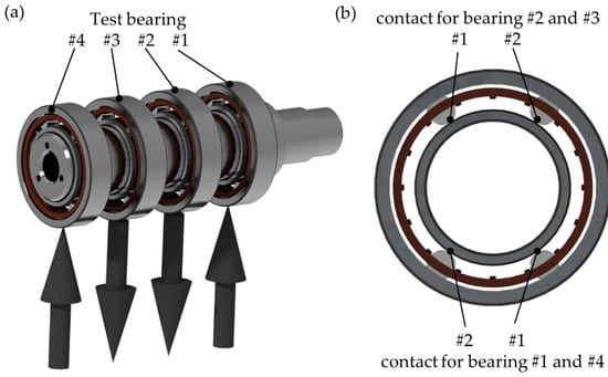 The number of rolling elements in each test bearing is reduced to four (see Figure 2b). They are arranged symmetrically, whereby only the two rolling elements at the bottom or the top are loaded according to the radial load for each test bearing. The remaining two rolling elements serve purely to guide the cage. This setup has several advantages: The force that is required to achieve the intended contact pressure is reduced; moreover, even at larger oscillation angles, the contact areas of adjacent contacts do not intersect, which significantly improves the possibility of evaluating and analyzing the damage.