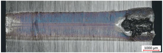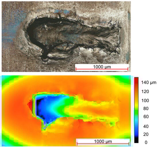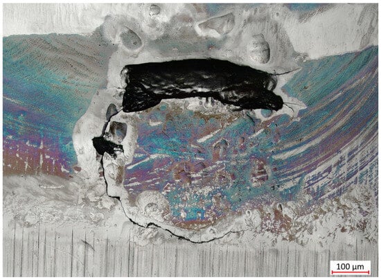 Prior to testing, unneeded rolling elements are removed and the bearings are cleaned by hand with isopropanol. All tests are performed with FVA 3 oil at 30 °C at a total flow rate of 4 L/min (0.5 L/min for each of the eight lubrication points). After testing, a laser scanning microscope (Keyence VK-X200, Keyence Deutschland GmbH, Neu-Isenburg, Germany) is used to evaluate and qualitatively assess the contact zone/track (see Figure 3c).