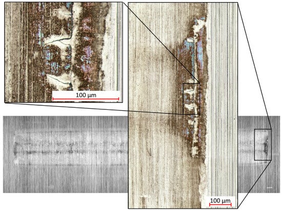 The location and shape of the observed spalling are similar for all tests. The spalling is located at the outer end of the contact track in all tests (see Figure 4). The spalling runs at an angle of approx. 45° from the surface into the depth (orthogonal to the oscillation direction). The deepest point is characterized by a course of almost 90° to the surface, which can be observed in particular in the spalling on the inner ring. In addition, a kind of elevation can be observed in the center of the spalling, which corresponds to the center of the oscillation movement. This elevation can be measured, but is also very easy to recognize optically (see Figure 5).