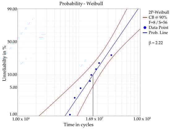 To compare the theoretically calculated rating life with the actual rating life, the actual rating life must first be determined. For this purpose, the experimental rating life B10 is calculated for a 10% probability of failure using the failure times of the eight rating life tests (RV 1-5 and SV 1-3) and a 2-parametric Weibull distribution. This results in an experimental rating life of B10 = 16.99 × 106 oscillation cycles (see Figure 8).