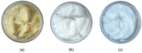 The grease production process was adapted from previous studies [49,50]. To ensure a consistent comparative analysis, the PTFE thickener was fixed at 50 wt%. The base oil was mechanically stirred at room temperature (27 °C) for five minutes at 200 rpm. The stirrer speed was then increased to 400 rpm, and the PTFE powder was added slowly over 10 min. The mixture was heated to 80 °C and stirred for an additional 30 min at 1000 rpm. It was then left to cool at room temperature without further stirring. The cooled mixture was rolled through a two-roller mill three times to ensure homogeneity. Representative photos of the produced greases are shown in Figure 1a–c. A series of tests, detailed in Table 1, were conducted to characterize the grease samples and determine their properties according to international standards.