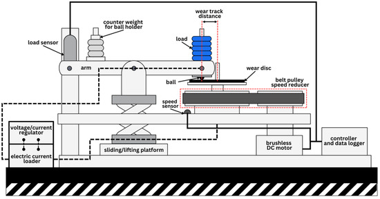 Friction tests were conducted using a custom-made tribometer, configured for a ball-on-disk contact, as shown in Figure 2. The tribometer had a grounded electrical current flow path through the point contact between the ball and the disk. At a rotational speed of 500 rpm, the normal load was adjusted from 80 g to 160 g in 20 g increments. Each test took approximately 255 s to cover a distance of 200 m, with a new set of balls and disks for each configuration. Before each main friction measurement, an initial run-in trial was conducted on each ball and disk using a 60 g load at 1000 rpm for 60 s. This run-in process stabilizes the contact surfaces and ensures consistent and reliable results in the subsequent friction tests [51].