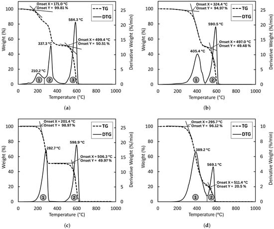 Based on the thermogravimetric (TG) plot in Figure 3, the thermal decomposition onset temperature () can be determined to evaluate the oxidative stability of the grease samples and their suitability as lubricants. This onset temperature indicates the minimum temperature before the vaporization of volatile components [49]. For all samples, the initial weight loss is less than 5 wt% before , indicating minimal water content and contributing to their stability as lubricants. Generally, the for each sample occurs within 171.0 to 324.4 °C. The decomposition of grease typically occurs in two weight loss steps, as shown in the derivative TG (DTG) plot in Figure 3. The first step represents the evaporation of lower molecular weight compounds, such as hydrocarbons or base oil, while the second step corresponds to the decomposition of higher molecular weight compounds, often the thickener [57,58]. Thus, the extended thermal stability beyond 400 °C is attributed to the presence of the PTFE thickener, similar to reported results in the literature [30].