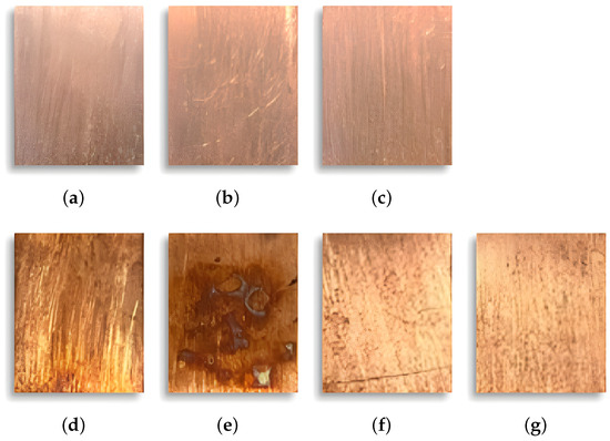 Corrosion test comparisons for (a) freshly polished copper strip, and tested strips using (b) [Oley][Oleic] base oil, (c) [Oley][Oleic] grease, (d) TMPO base oil, (e) TMPO grease, (f) PAO4 base oil, and (g) PAO4 grease.