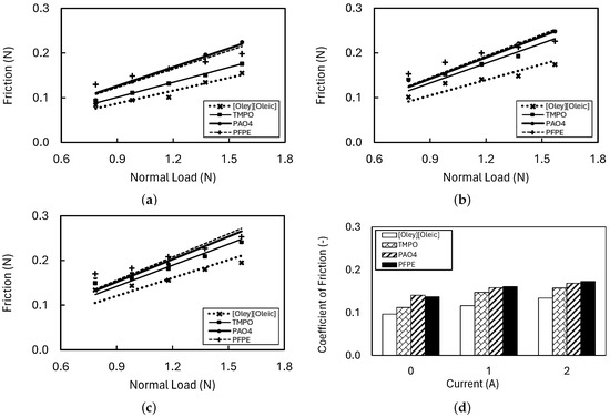 Friction against load for PTFE greases with different base oils at 4.5 V and 500 rpm: (a) no current, (b) 1 A, (c) 2 A, and (d) the coefficient of friction (CoF).