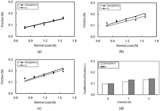 Friction against load for [Oley][Oleic] and LI greases at 4.5 V and 500 rpm: (a) no current, (b) 1 A, (c) 2 A, and (d) coefficient of friction (CoF).