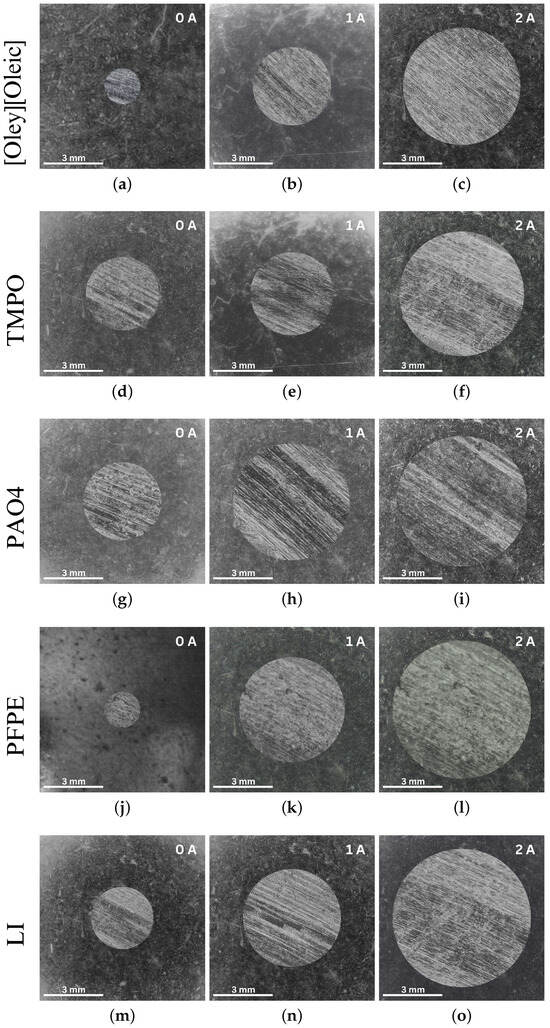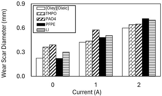 To further elucidate the tribological performance, wear measurements for each configuration are reported. Figure 7a–o show the ball wear scar diameter for all samples under no current, 1 A, and 2 A conditions. The ball scar diameter increases for all samples when current is introduced. Without current, [Oley][Oleic] and PFPE greases exhibit better wear-reducing properties, while TMPO, PAO4, and LI greases show larger wear scar diameters.