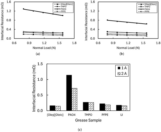 The analysis of greases under triboelectric conditions shows that [Oley][Oleic] grease outperforms other greases, including commercial PFPE and LI greases, in terms of friction and wear characteristics, especially with electrical current present. To elucidate this observation, the interfacial resistance () of each sample was determined using Equation (3) from the measured potential drop (), as shown in Figure 9.