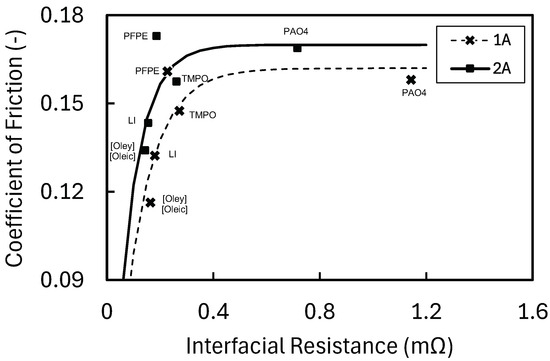 To illustrate this relationship, Figure 10 plots the change of CoF with interfacial resistance for all grease samples. The CoF increases, and then saturates at higher interfacial resistance values. PAO4 grease exhibited high resistance, due to its non-polar and non-conductive nature [55], consistent with its less desirable frictional performance under triboelectric conditions. In contrast, [Oley][Oleic] grease showed the lowest average interfacial resistance, at 0.165 and 0.145 mΩ under 1 and 2 A electrical currents, respectively. Compared to commercial PFPE grease, [Oley][Oleic] grease had 27.5% and 22.7% lower resistance at 1 and 2 A, respectively.