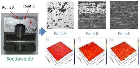 On the one hand, the friction and wear of rotary compressors largely result from the complex motions of the components. A rotary compressor contains many specially designed components (see Figure 2), such as a rolling piston, sliding vane, crankshaft, cylinder, main bearing, and sub-bearing [,]. Driven by an AC motor, the former three components undergo complex motions during operation, thus leading to the time-varying interacting forces between the components [,]. In the working process of the compressor, the complex motions of the moving components will change the lubrication performance of the interacting surfaces, which can enter into a mixed lubrication regime when the load-carrying capacity of the oil film is not enough. As shown in Figure 3, owing to the angular displacement of the vane, the severe wear of the vane slot on the suction side occurs in the region close to the cylinder wall. On the other hand, different types of friction pairs within a compressor with coupling effects increase the complexity of the tribological process. For a typical rotary compressor, there are mainly seven friction pairs (see Figure 4), which can be affected by each other owing to multi-body coupling [,,]. During operation, these different types of friction pairs show different operation performances, and the mutual influence between them is a nonnegligible factor.