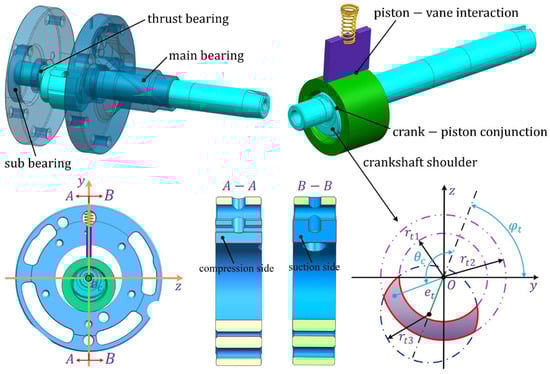 In view of the vane–piston interaction, the sliding vane and the rolling piston were considered together in theoretical modeling and analysis. To achieve decoupling, the translational movements in three directions and the angular displacements in two directions of the crankshaft are ignored, which only rotates along the rotor axis. The vane–slot conjunction and the vane–piston interaction are the main friction pairs for the sliding vane, while those for the rolling piston are the crank–piston conjunction and the vane–piston interaction. For performance improvement, the mixed lubrication performance of these friction pairs has been investigated for a long time.