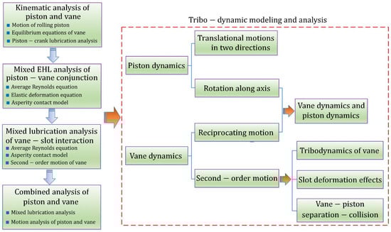 - Considering the disadvantages of the theoretical models of a part of the moving components or a part of the friction pairs, tribodynamic modeling of the whole compressor has been implemented in recent years. To conduct the modeling study of the vane–piston system and the crankshaft separately, decoupling of the moving components needs to be achieved, resulting in the extra assumptions. To improve decoupling model accuracy, second-order motion, elastic deformation, and groove distribution have been considered in the previous studies. With the increasing effects of multibody coupling, the modeling and analysis of the whole compressor is the preference.