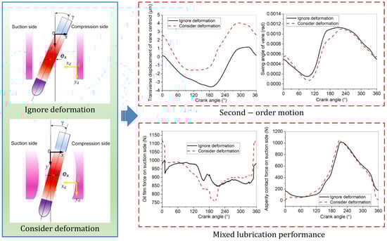 Considering the increasing impacts of dynamic processes, tribodynamic models coupling dynamic behaviors and mixed lubrication have become the preferences in the current stage (see Table 1 and Figure 6). Considering the one-dimensional vane dynamics and the one-dimensional piston dynamics together, Padhy [] proposed a mathematical model to analyze the tribo-dynamic performance of the compressor, which was verified by their experiments []. Coupling the momentum equations and the Reynolds equation, a two-degree-of-freedom tribodynamic model of the rolling piston was first built by Minami et al. []. By comparison, the results showed that the lubrication performance with R410a refrigerant is better than that with R22. Considering second-order motion, Geng et al. [] first established a two-degree-of-freedom tribodynamic model of the sliding vane. Based on their dynamic solution, it was found that second-order motion characteristics worsen the lubrication status of the vane–slot conjunction on the suction side. Later on, the mathematical model was modified to analyze the separation–collision process between the vane tip and the rolling piston []. The simulation results indicated that the separation–collision behaviors are closely related to the spring stiffness and the rotation velocity of the shaft. In engineering applications, both the vane slot and the sliding vane are processed with the groove structures, such as the spring groove, the vertical groove, and the dovetail groove. To consider groove effects, Li et al. [] proposed an improved tribodynamic model for the sliding vane, in which the cylinder deformation caused by the chamber pressures is also calculated. In their work, the fluid pressure within the groove was assumed to be equal to the discharge pressure, and the pressure distribution at the boundaries was also defined. As the interacting area between the vane and the slot changed with the crank angle, the pressure boundary conditions were updated before the pressure iteration. It was found that the cylinder deformation has a significant influence on the second-order motion of the vane and the mixed lubrication performance of the vane–slot conjunction (see Figure 7). After their comparison, the optimal vertical groove was proved to reduce the friction loss and wear between the sliding vane and the vane slot. In Geng and Li’s work, it was assumed that the direction of the sliding speed between the vane tip and the rolling piston remained unchanged, and the normal interacting force of the vane–piston conjunction was obtained based on the force equilibrium.