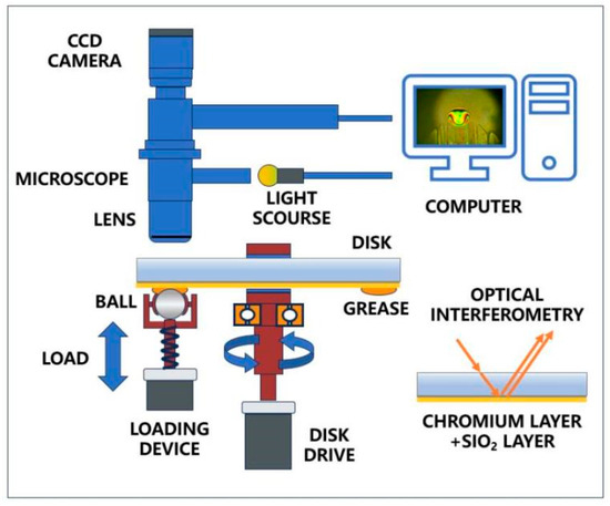 This K9 glass disc has a bottom layer of SiO2 (120 nm thick) for partial reflection and a 15 nm thick chromium coating film on the side that contacts the steel ball. The steel ball’s composition is G5-precision GCr15 steel. Four self-made lithium-based greases, Yangtze Grease 1 (YG 1), Yangtze Grease 2 (YG 2), Yangtze Grease 3 (YG 3), and Yangtze Grease 4 (YG 4), were selected. The specific parameters of the steel ball and glass disk are shown in Table 1. The specific parameters of the four types of grease are shown in Table 2.