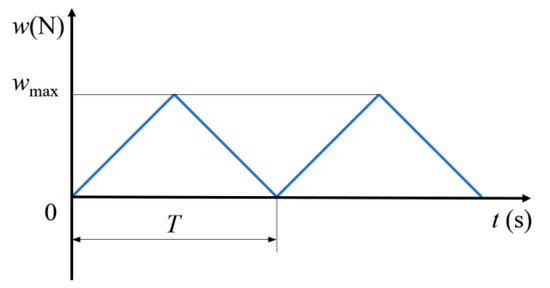 Experiments were carried out using a self-made point-contact impact-sliding-load optical interferometric EHL machine (a schematic diagram is shown in Figure 1). The optical interference test rig consists of a light source, a motion control module, a loading module, an image acquisition module, and a test bench body. The experimental platform combines optical interferometry to effectively and accurately measure the thickness of lubricating film. The basic principle of the optical interference method is that the incident light is reflected on the contact surface between the steel ball and the glass disk of the friction pair, and the two coherent light columns after reflection meet to produce interference fringes. The brightness, color, and order of interference of the fringes reflect the size of the film thickness. In the experiment, we first used red and green dual-color light to illuminate the contact points and then captured optical interference images using a CCD camera and software based on Dichromatic Interference Intensity Modulation (DIIM) technology to measure the thickness of the lubricating grease film [40]. We used specialized software to measure the collected optical interference patterns and obtain the thickness of the lubricating grease film. In order to achieve the expected changes in glass disk speed and steel ball impact load, the servo motor was programmed using PLC. Figure 2 illustrates the load variation during the load variation cycle. The load undergoes cyclic impact in the form of triangular waves.