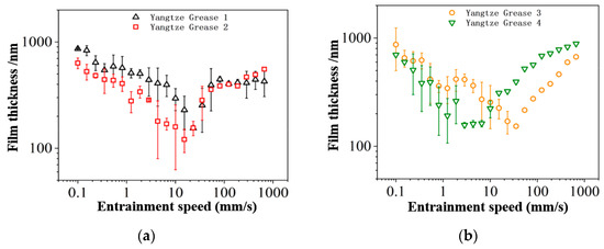 Film thickness versus entrainment speed (15 N): (a) YG 1 and YG 2; (b) YG 3 and YG 4.