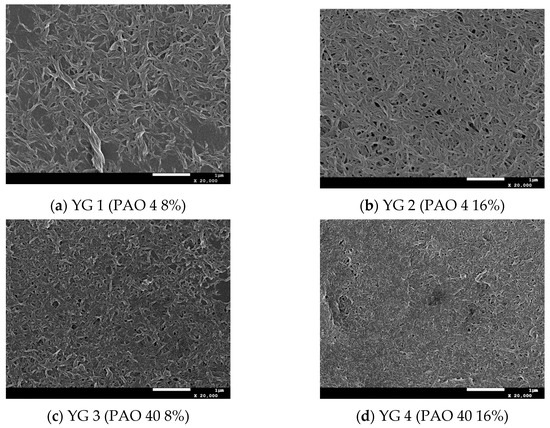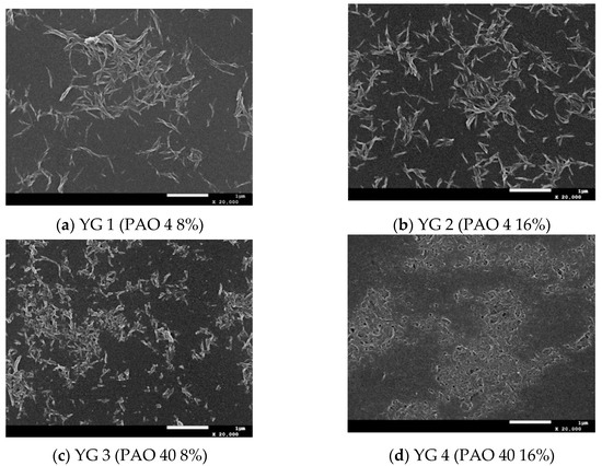 Figure 4 shows the FESEM images of the fiber structures of the four kinds of greases; the magnification is 20,000 times. From an overall point of view, the entanglement of the thickener fibers of greases YG 3 and YG 4 is greater than that of greases YG 1 and YG 2.