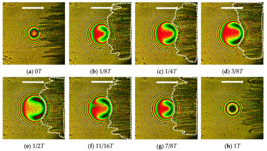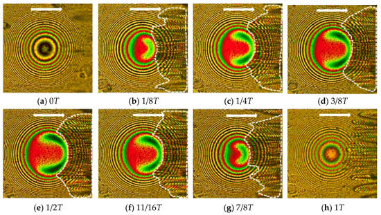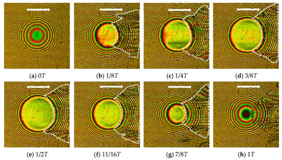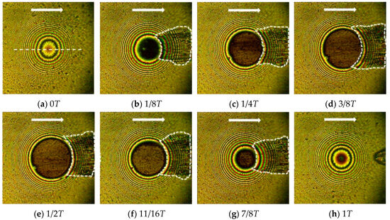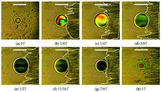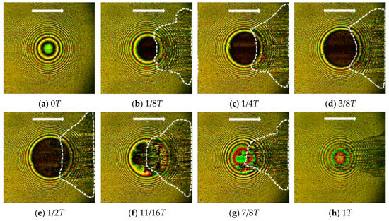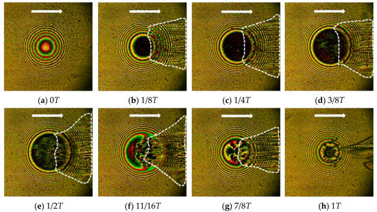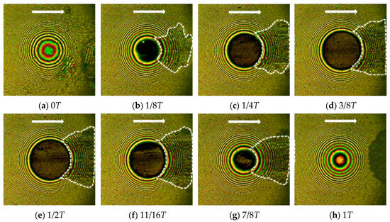 Figure 6 shows the optical interferometric images of the first period of the impact-sliding experiment with YG 1. The sliding speed is 0.01 m/s (Experiment 1 in Table 3), and the impact frequency is 1 Hz. The arrow in the figure indicates the sliding direction. Figure 7 shows the film thickness profiles at the mid-section, corresponding to the position marked by the dashed line in Figure 6. Figure 6a illustrates that the grease film thickness between the steel ball and the glass disk is approximately 0.58 μm at the onset of the experiment. At the instant depicted in Figure 6b, the central contact area expands as the load increases. Due to the existence of tangential velocity, a cavitation area (the area surrounded by the white dotted line in the interferogram) appears in the exit area, and the film thickness in the central region rapidly diminishes to 0.052 μm, as shown in Figure 7b. In Figure 6c–g, the grease at the contact area is depleted, and there is only a very thin layer of lubricating film between the steel ball and the glass disk. At time 1/2T of the maximum load, the grease thickness is only 12 nm (Figure 7c–g). At the end of the first cycle (Figure 6h), the steel ball returns to the initial position, the load becomes zero, the grease returns between the two contact surfaces, and the film thickness of the grease returns to 0.54 μm.