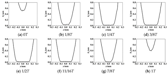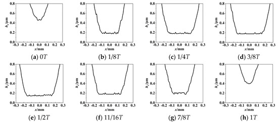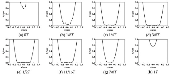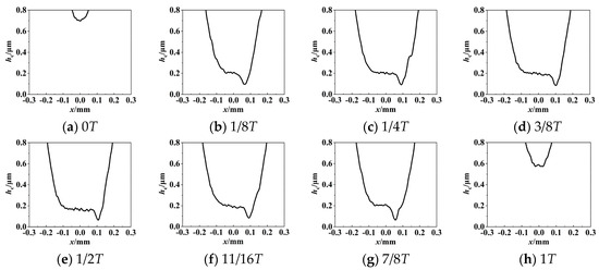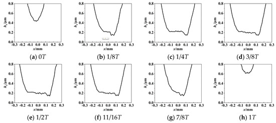 Figure 10 presents the optical interference pattern of YG 2 within one cycle during the experiment. Unlike YG 1, the sliding speed is 0.01 m/s, and the thickener content in YG 2 increases from 8% to 16% (Experiment 3 in Table 3). Figure 11 presents the film thickness profiles at the mid-section, corresponding to the data shown in Figure 10. Comparing Figure 10 with Figure 6, it is evident that when the sliding speed is 0.01 m/s, the increase in the thickener content does not improve the lubrication of the contact area significantly at 1/4T, 3/8T, 1/2T, 11/16T, and 7/8T. From 1/8T (Figure 10b) to 7/8T (Figure 10g), the grease is depleted. In Figure 11b–g, compared with the corresponding time in Figure 7, the film thickness increases by about 4~5 nm. This shows that the increase in thickener content has a certain influence on the increase in the thickness of the grease film.