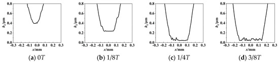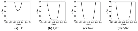Figure 18 presents the interferograms of YG 4 at a sliding velocity of 0.01 m/s (Experiment 7 in Table 3). Compared with grease YG 3, the thickener content increases from 8% to 16%. Figure 19 shows the film thickness profiles at the mid-section for the corresponding time intervals. At the instant shown in Figure 18a, a substantial presence of grease fiber clusters is observed between the two interfacing surfaces. In Figure 18b, as the load increases, the contact region continues expanding, and a large grease fiber cluster appears in the lower half of the contact area. The appearance of the fiber cluster greatly increases grease film thickness. In Figure 19b, an obvious bump is formed in the grease film curve. At the 1/4T instant shown in Figure 18c, the grease fiber cluster has moved out of the contact region, and only a thicker grease film exists in the upper half of the contact region. Starting from Figure 18d, the lubrication state presents a similar variation to that in Figure 14 (Experiment 5). Compared to Figure 19 and Figure 15, the increase in thickener content did not increase film thickness, but the minimum film thickness in the mid-section was close to zero during the unloading stage.