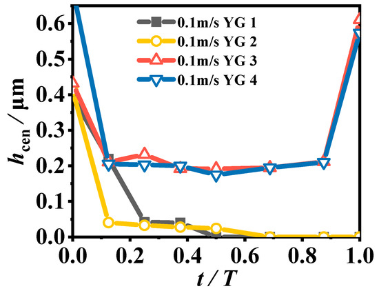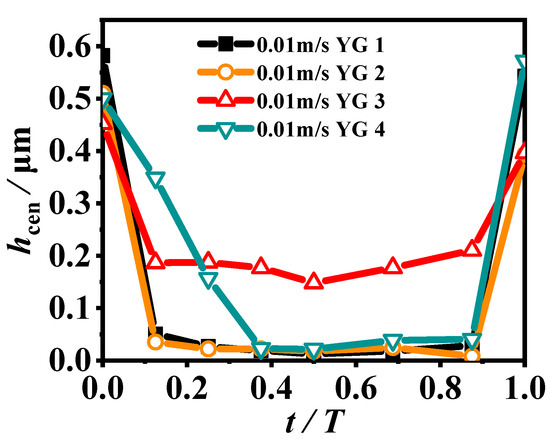 To elucidate the impact of grease composition on lubrication performance more comprehensively, Figure 22 and Figure 23 show the comparison curves of four types of grease film thickness under two sliding speed conditions. T is the period, t is the time, and the vertical ordinate is the central film thickness of the grease lubrication contact region.