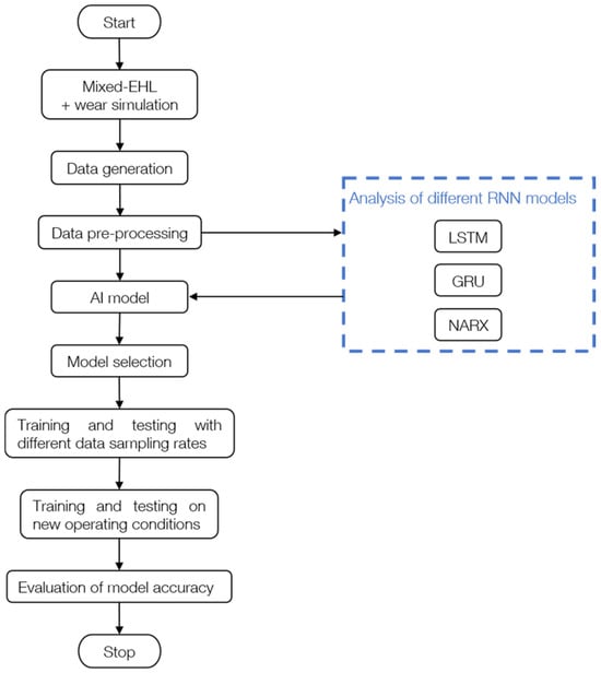 The transient data obtained from the simulation model can be treated as a time series for ML-based surrogate modeling. Pragmatically speaking, wear monitoring and prognosis are a combination of regression modeling between input and output data and time series forecasting, commonly performed with RNNs, which are used to predict posterior data while considering the previous and current state of the system. RNNs are able to retain past sequential data in memory, making them exceptionally well-suited for tasks involving sequential data, such as time series analysis. Following the pre-processing of the data obtained from mixed EHL and wear simulations, the different RNN architectures LSTM, GRU, and NARX were trained and compared. These architectures are further introduced in Section 2.4.1, Section 2.4.2 and Section 2.4.3.