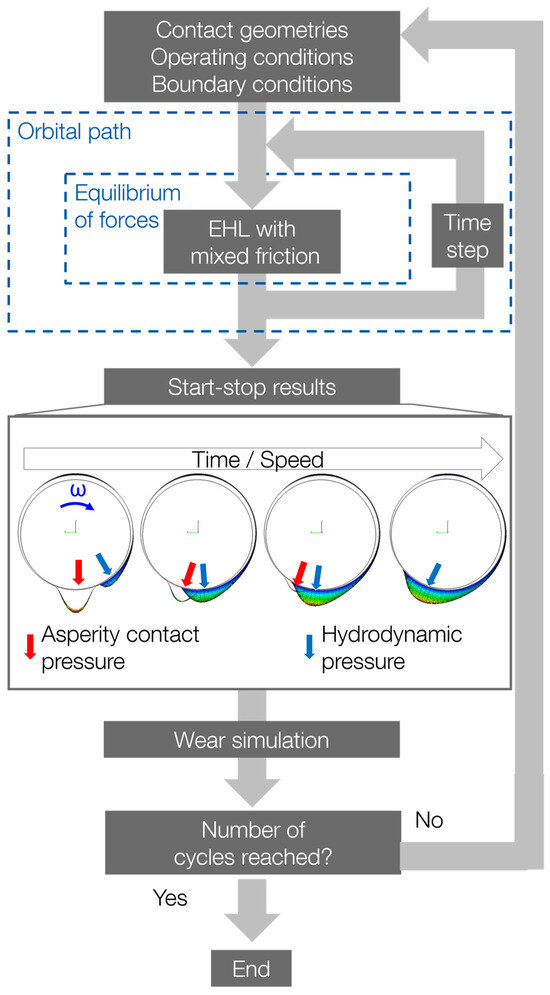 In this study, a coupled transient mixed-elasto-hydrodynamic (mixed-EHL) and wear simulation model is used to simulate the wear behavior during multiple thousand start–stop cycles. The basic structure of the physical simulation model and its combination with a wear simulation with empirical wear laws is shown in Figure 2.