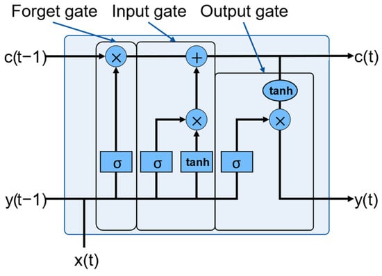 Long Short-Term Memory (LSTM) is an RNN that avoids the vanishing gradient problem, which occurs during the training of long time series. As shown in Figure 3, LSTMs feature a unique architecture comprising an input gate, a forget gate, and an output gate, enabling them to retain and utilize information over extended sequences selectively. The input gate regulates the flow of new inputs (labeled x) into the cell state (labeled c). Conversely, the forget gate determines which information from the previous cell state is discarded, thereby facilitating the preservation of relevant long-term dependencies. Finally, the output gate controls the flow of information from the cell state to the output (labeled y). This gating mechanism allows LSTMs to capture and retain important temporal dependencies, making them particularly interesting for using sequential data [16,17,18].