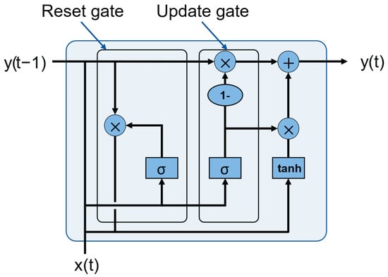 Gated Recurrent Unit (GRU) networks are a specialized variant of RNNs, similar to LSTM networks, designed to overcome the vanishing gradient problem inherent in traditional RNN architectures. Compared to LSTMs, GRUs employ a simpler architecture, featuring fewer gating mechanisms while maintaining competitive performance [17]. Within the GRU architecture, depicted in Figure 4, two primary gates regulate the flow of information: the update gate and the reset gate. The update gate in GRUs governs the flow of new inputs (labeled x) into the current state (labeled c), deciding how much past information to retain and how much new information to integrate. Similarly, the reset gate adjusts the contribution of past information when computing the current state, facilitating selective forgetting of irrelevant information. GRU models dynamically adjust these gates to capture and retain relevant information over extended sequences. Compared to LSTMs, GRUs are easier to train and faster to execute at the cost of modeling accuracy [19,20].