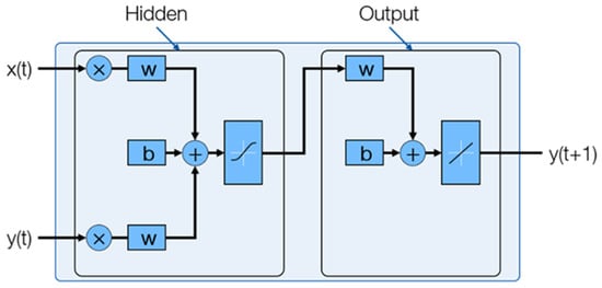 The NARX model equation is shown in Equation (2), where y(t), the predicted value of the model, is predicted using its previous values, y(t − 1) to y(t − ny), and the corresponding previous values of an input signal, x(t − 1) to x(t − nx). There are two forms of NARX architecture: series-parallel and parallel architecture. The series-parallel NARX architecture was chosen for this study as the availability of the previous values of y(t) makes the network more accurate [26].