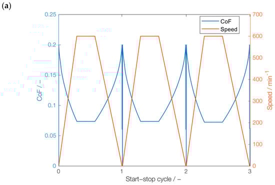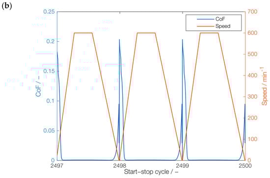 The speed and the coefficient of friction (CoF) predicted by the mixed-EHL model for the first three and last three start–stop cycles of series A are exemplarily shown in Figure 6a. It can be observed that the CoF is zero at the initial start-up and stopping time due to standstill. After a certain number of start–stop cycles, the CoF is significantly reduced due to the running in process. During the stationary phase, hydrodynamic lubrication is present, which leads to very low viscous friction losses, as it can be seen in Figure 6b.