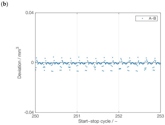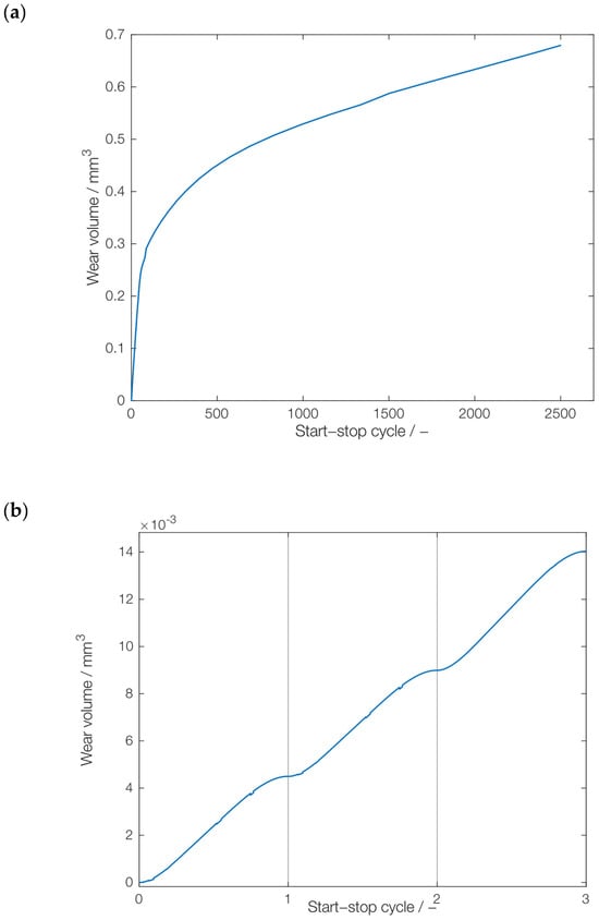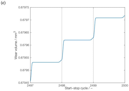 The results of the coupled wear simulation are exemplarily shown in Figure 7. Figure 7a shows the long-term trend of the wear volume. As it can be seen, the wear rate significantly decreases over the number of start–stop cycles after a pronounced wearing-in within the first few hundred start–stop cycles. Turning our attention to the seasonality, the wear volume generated within the first three cycles (1–3) is shown in Figure 7b, while the wear volume originated from the last three cycles (2498–2500) is shown in Figure 7c.